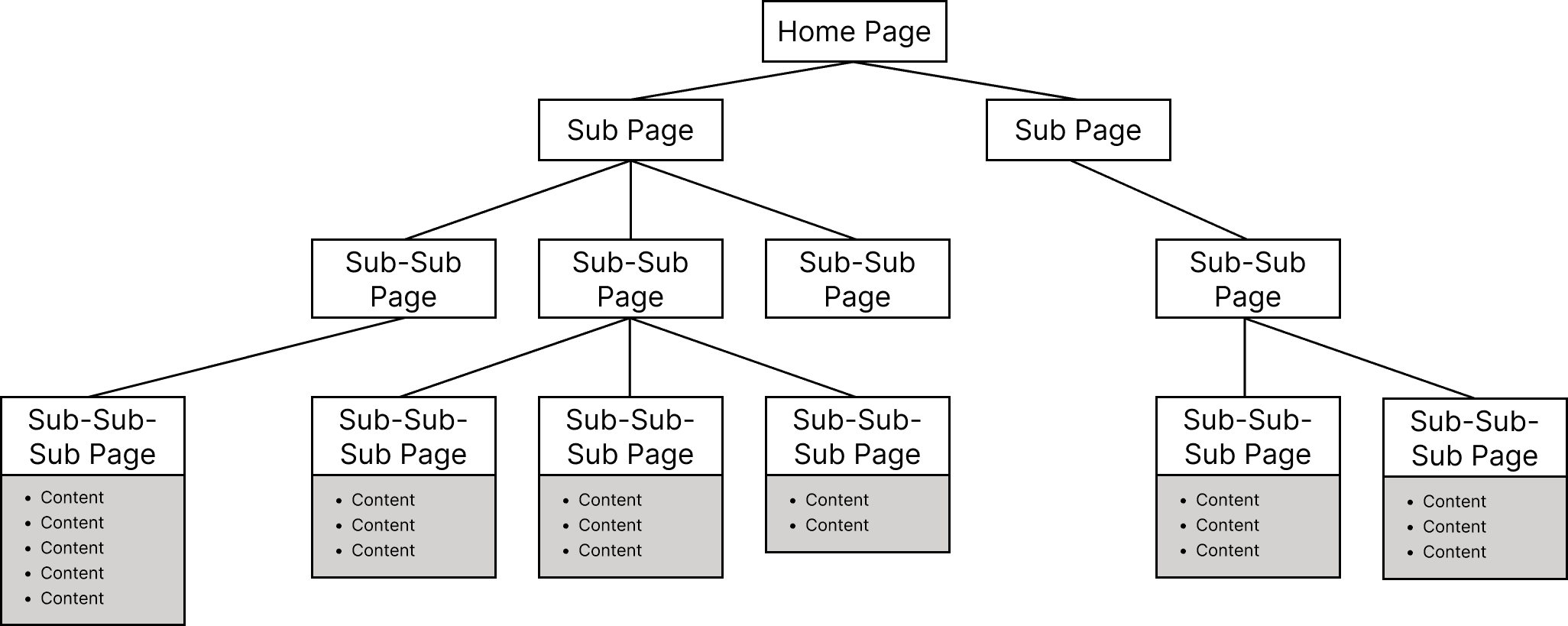 Next, I needed to gain a better understanding of the required content. I conducted several stakeholder content meetings, eventually creating a site map for the existing app layout, utilizing lines to relate pages and subpages, and calling out screen relationships and connections.