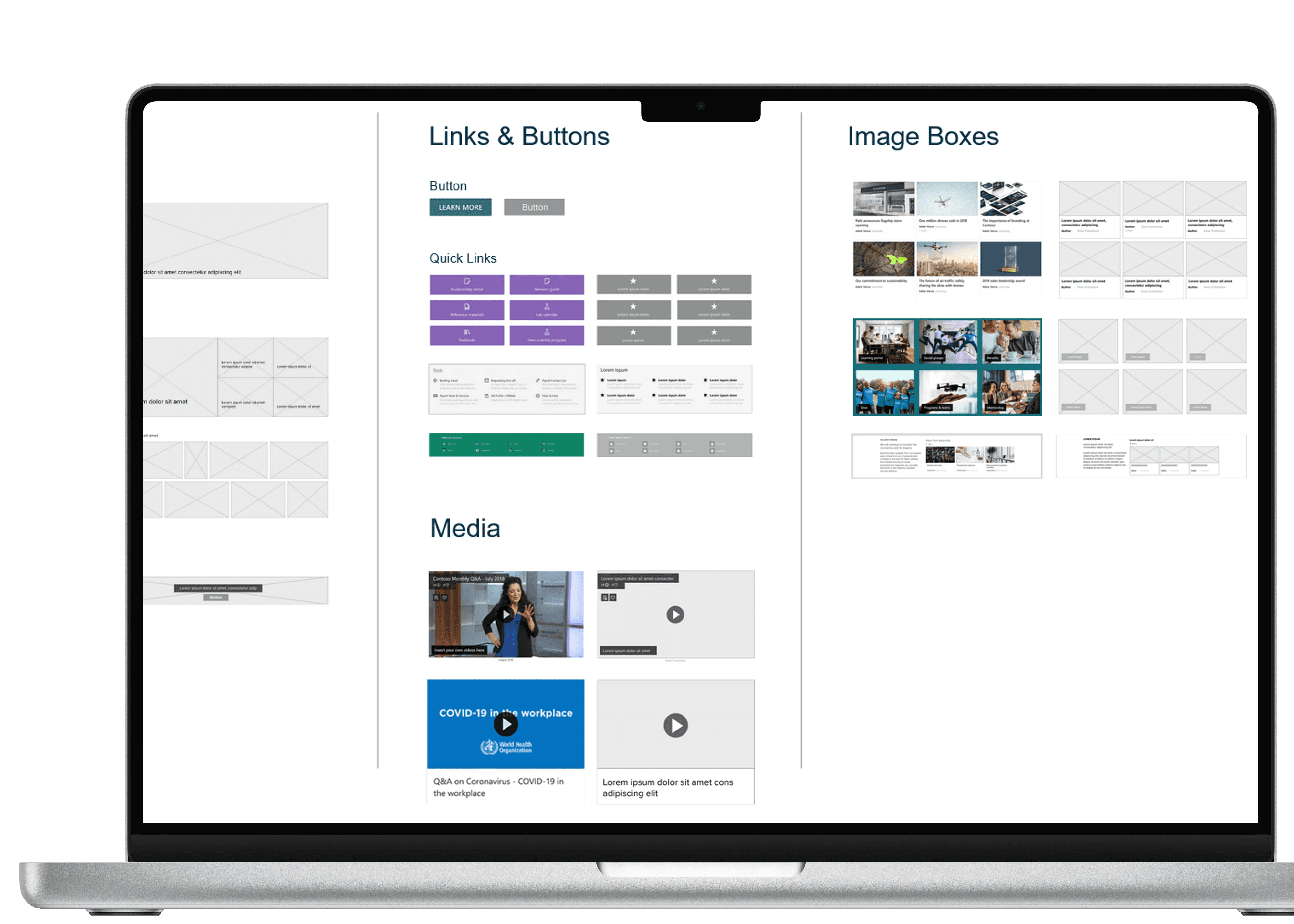 To make the components even more efficient for development, I ensured they were designed to scale easily and could be quickly dragged and dropped into various website templates. This was achieved by establishing consistent component sizing and maintaining clear, standardized spacing, all while adhering to the technical constraints of SharePoint. By aligning with SharePoint’s limitations and capabilities, the components were ready to be seamlessly integrated into the different sections of intranet mockups without requiring further adjustments.